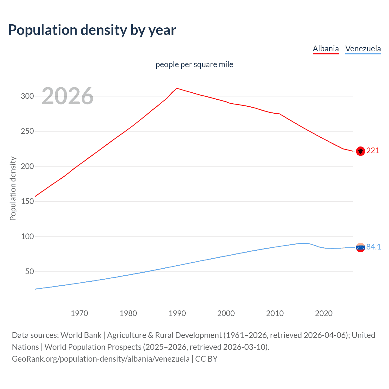 From 2006 to 2026, population density in Albania decreased by 21.7%, compared to a 5.16% growth in Venezuela.