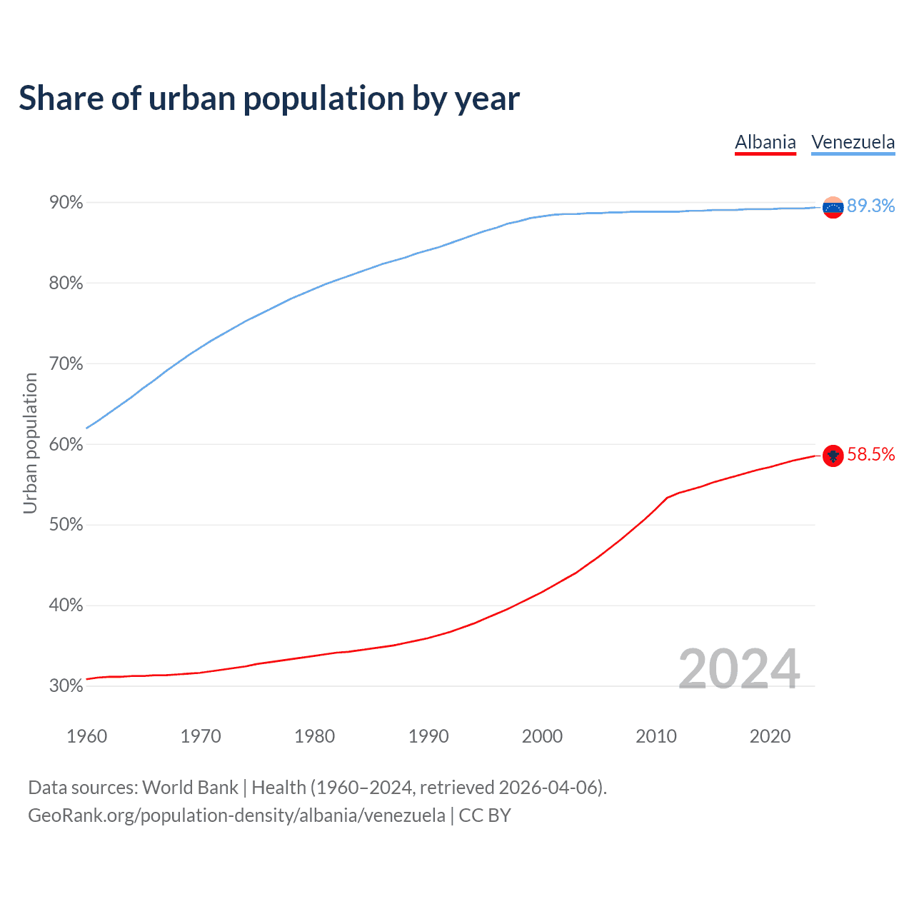 From 2004 to 2024, the share of urban population changed from 45% to 58.5% in Albania and from 88.6% to 89.3% in Venezuela.
