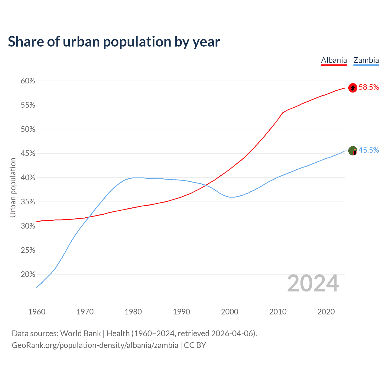 From 2004 to 2024, the share of urban population changed from 45% to 58.5% in Albania and from 36.8% to 45.5% in Zambia.
