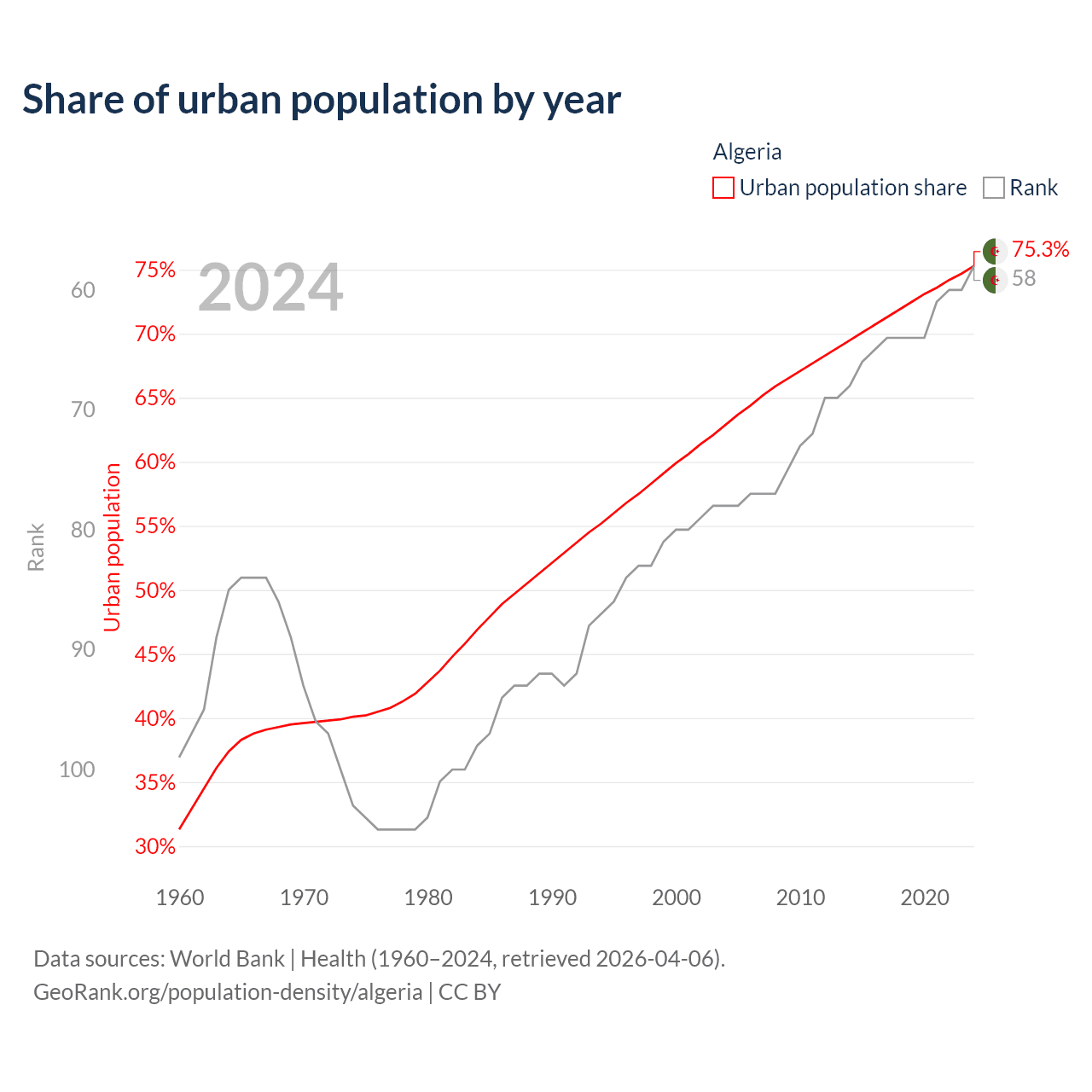 This chart shows the share of urban population in Algeria from 1960 to 2024: 31.3% lived in urban areas in 1960, 59.9% in 2000, and 75.3% in 2024.