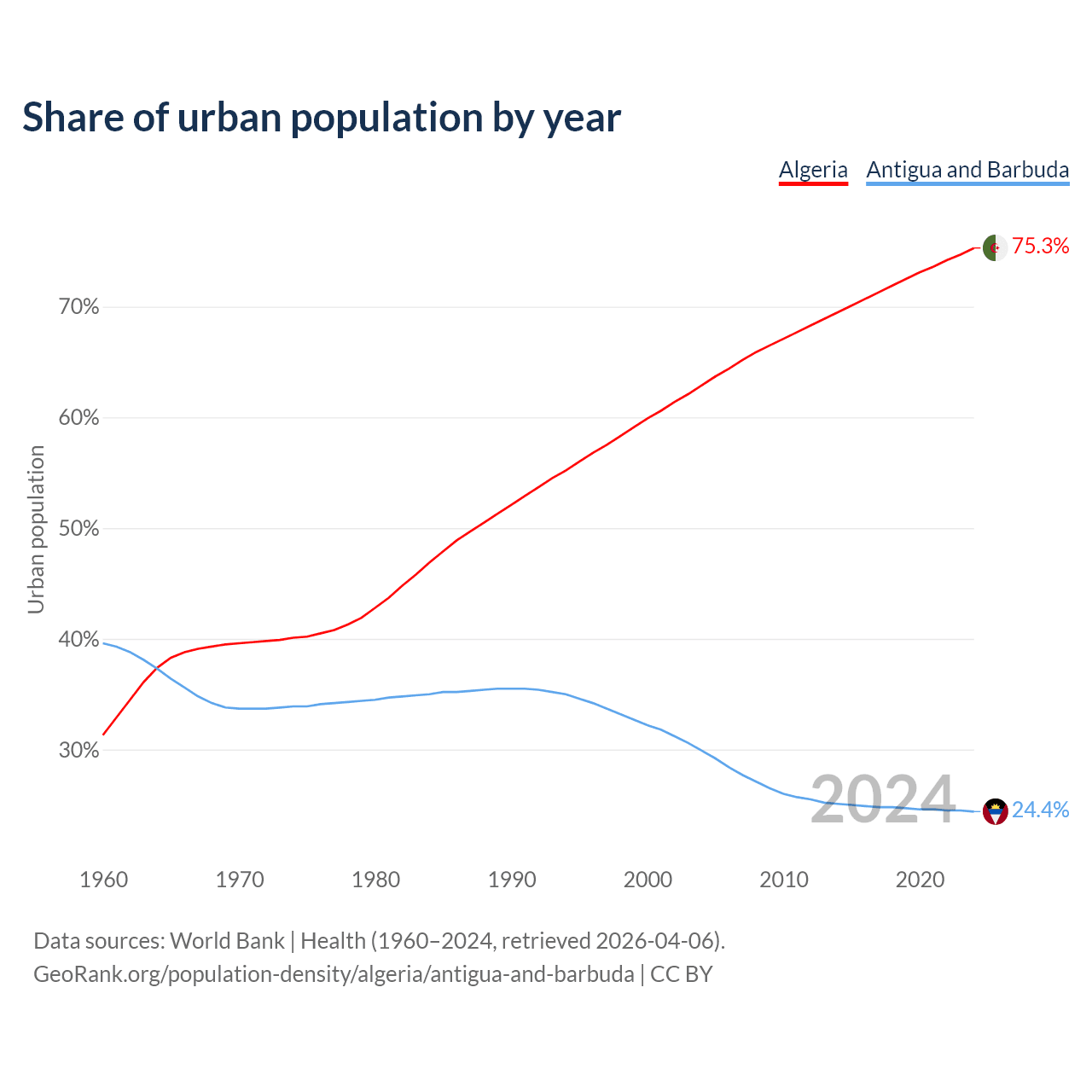From 2004 to 2024, the share of urban population changed from 62.9% to 75.3% in Algeria and from 29.9% to 24.4% in Antigua and Barbuda.
