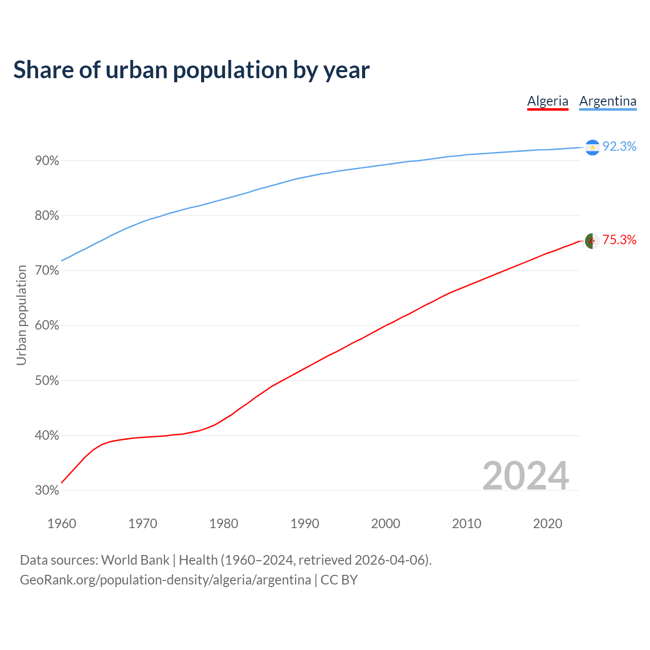 From 2004 to 2024, the share of urban population changed from 62.9% to 75.3% in Algeria and from 89.9% to 92.3% in Argentina.