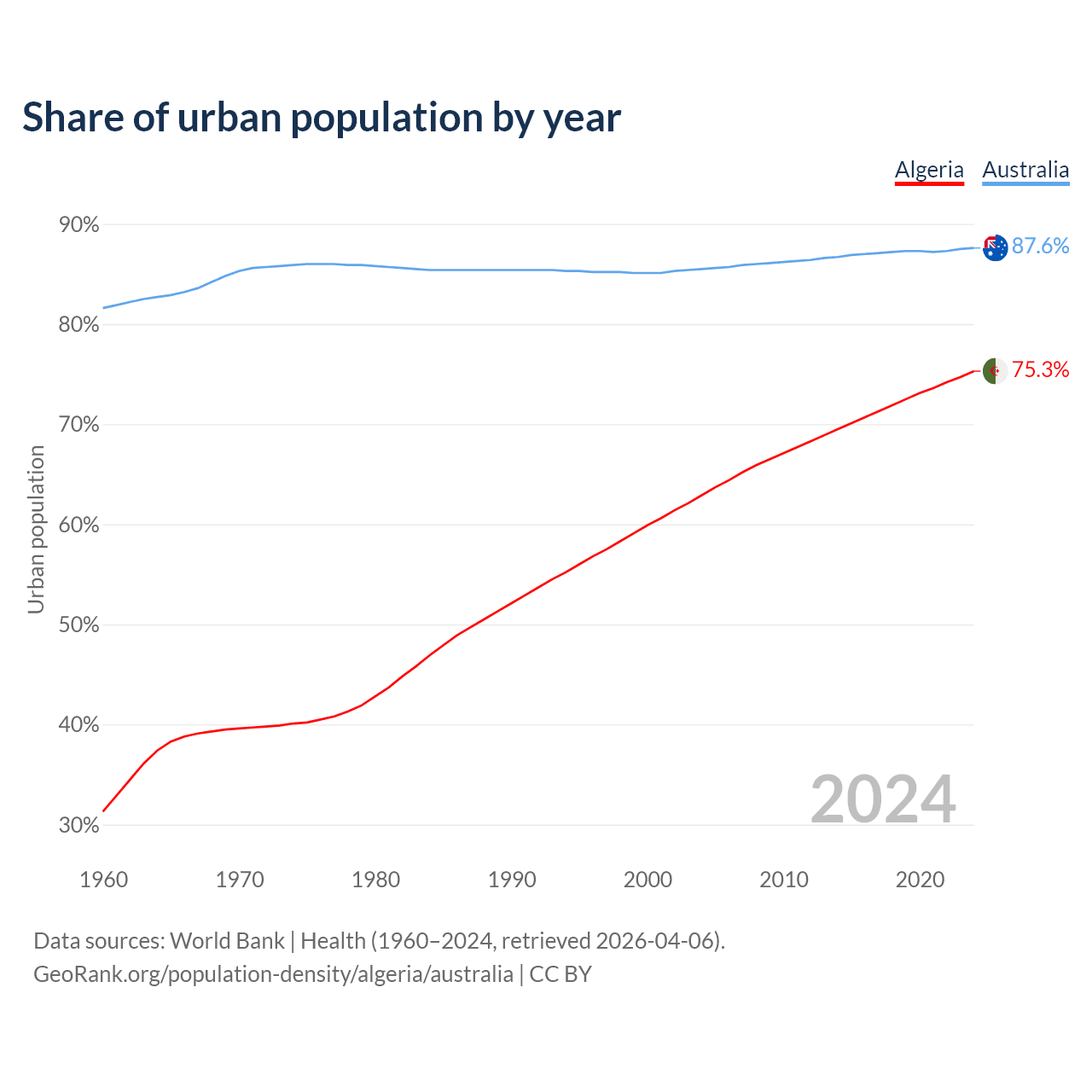 From 2004 to 2024, the share of urban population changed from 62.9% to 75.3% in Algeria and from 85.5% to 87.6% in Australia.