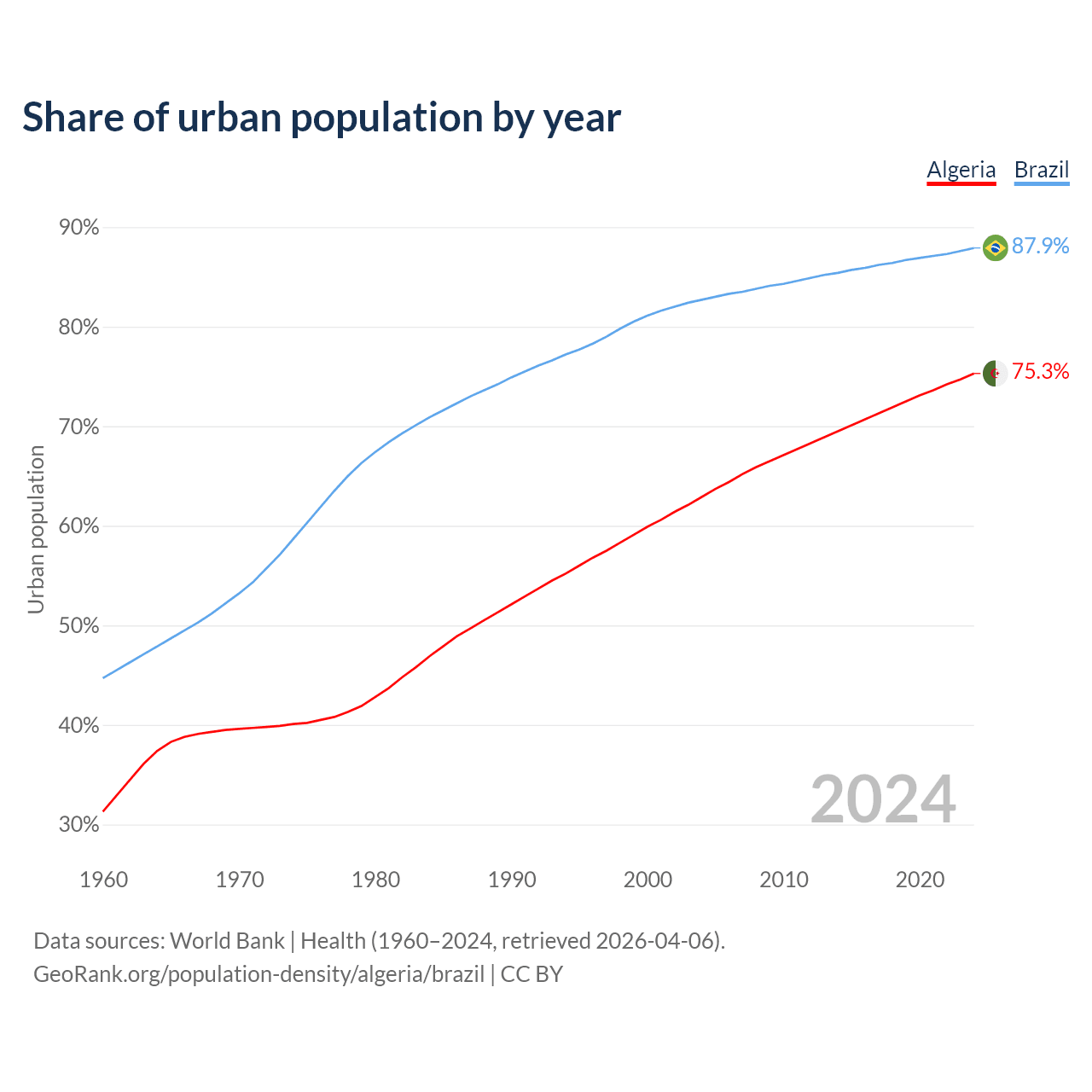 From 2004 to 2024, the share of urban population changed from 62.9% to 75.3% in Algeria and from 82.7% to 87.9% in Brazil.