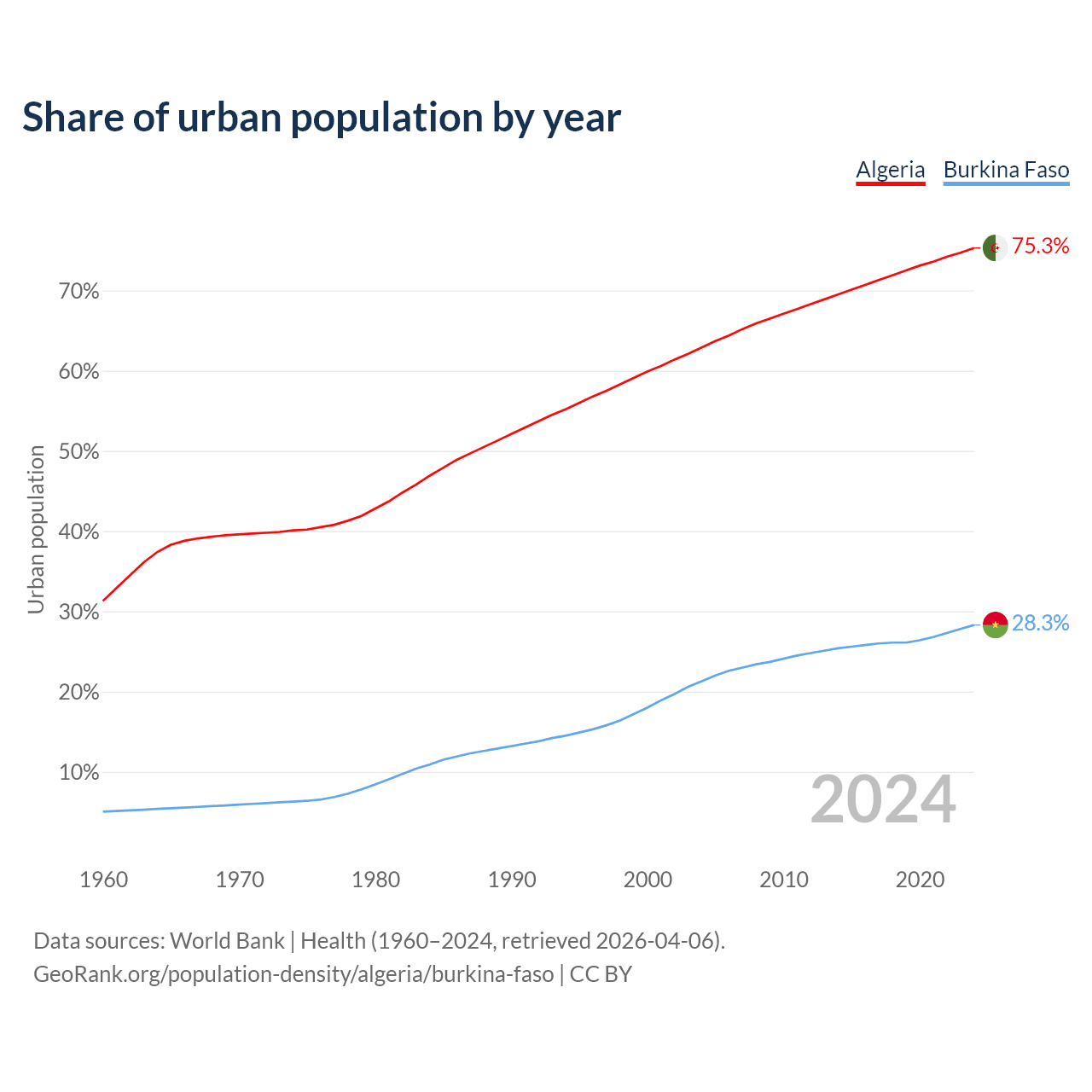 From 2004 to 2024, the share of urban population changed from 62.9% to 75.3% in Algeria and from 21.3% to 28.3% in Burkina Faso.