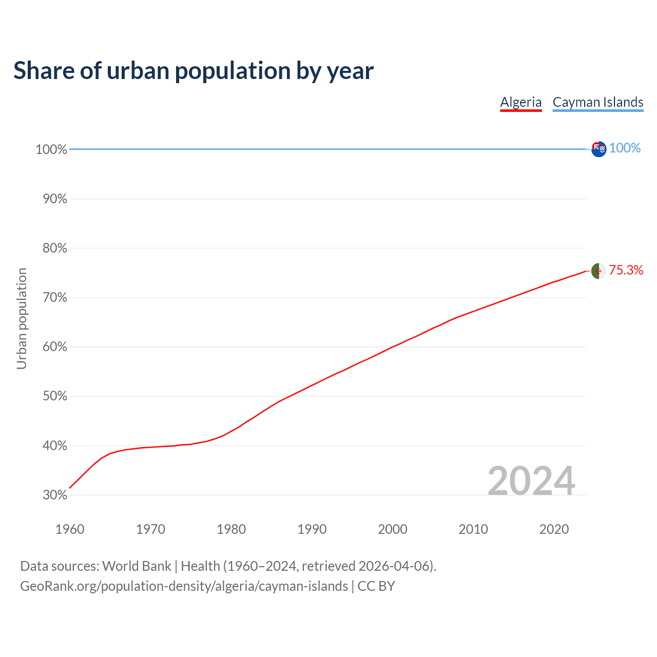 From 2004 to 2024, the share of urban population changed from 62.9% to 75.3% in Algeria and from 100% to 100% in the Cayman Islands.