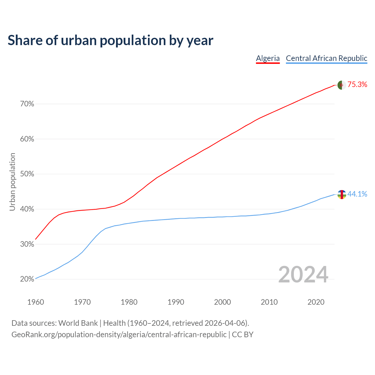 From 2004 to 2024, the share of urban population changed from 62.9% to 75.3% in Algeria and from 38% to 44.1% in the Central African Republic.