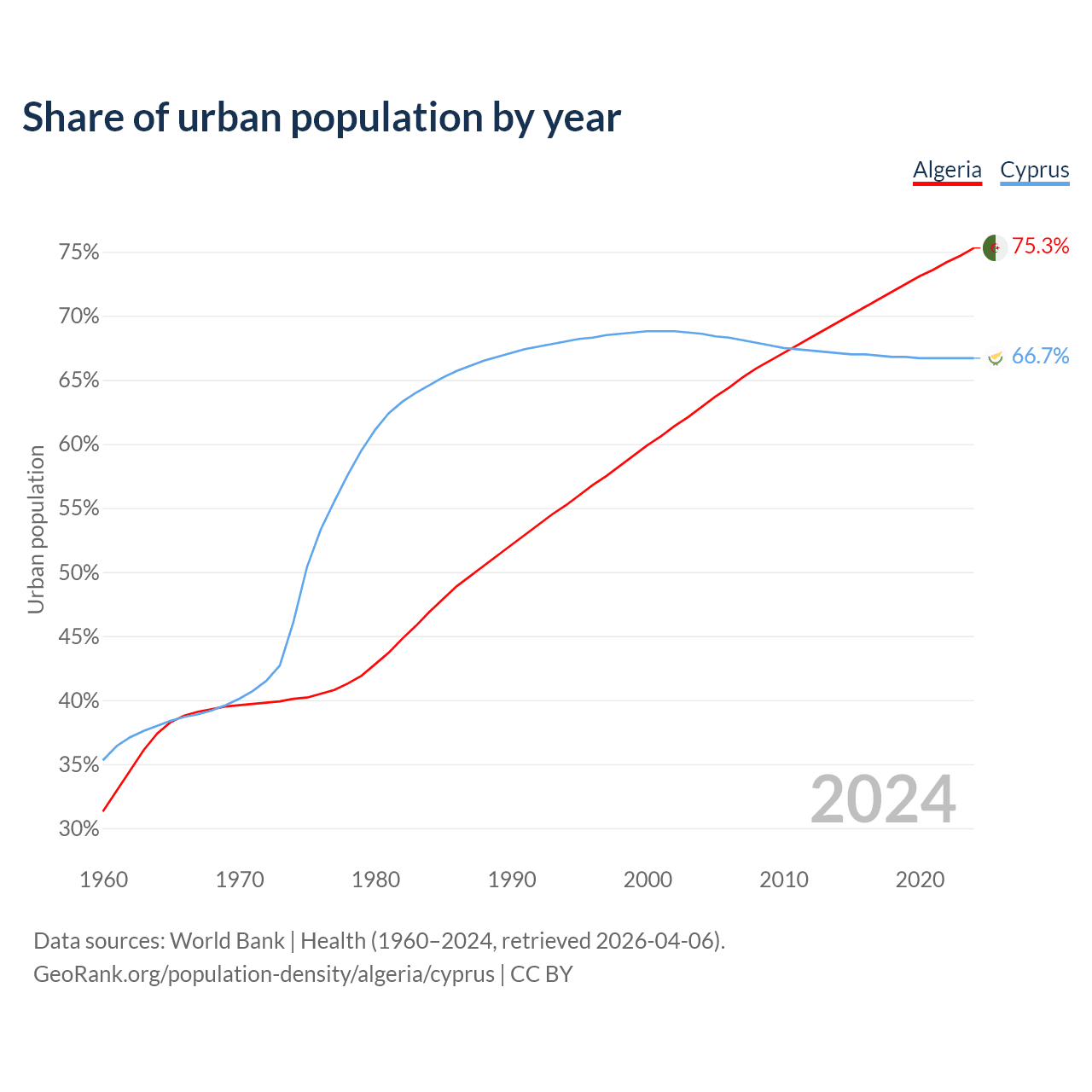 From 2004 to 2024, the share of urban population changed from 62.9% to 75.3% in Algeria and from 68.6% to 66.7% in Cyprus.