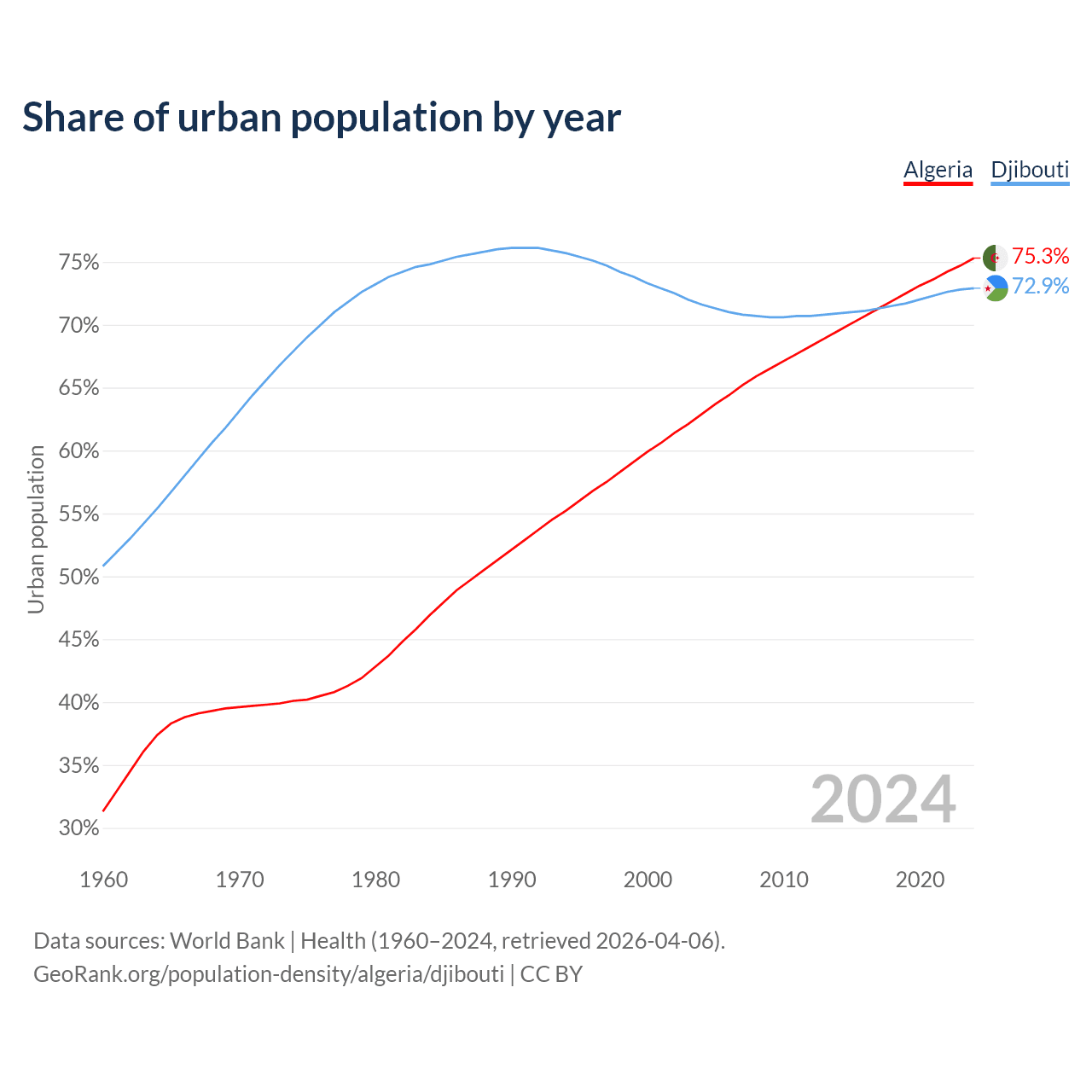 From 2004 to 2024, the share of urban population changed from 62.9% to 75.3% in Algeria and from 71.6% to 72.9% in Djibouti.