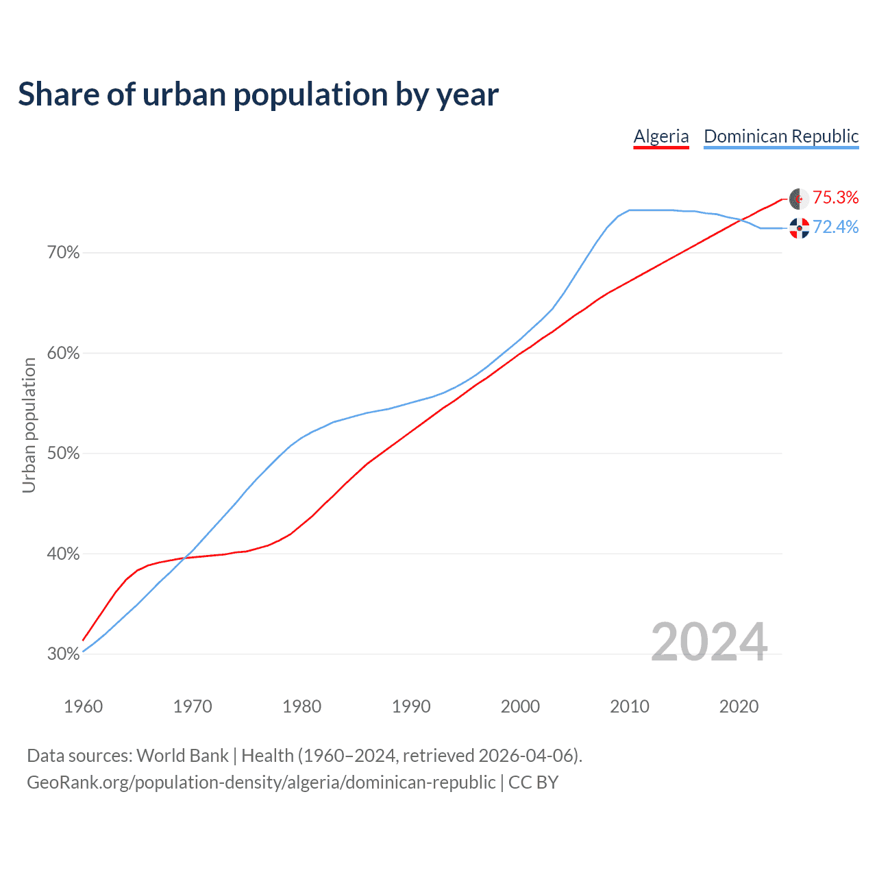 From 2004 to 2024, the share of urban population changed from 62.9% to 75.3% in Algeria and from 65.9% to 72.4% in the Dominican Republic.