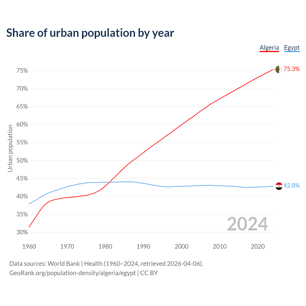 From 2004 to 2024, the share of urban population changed from 62.9% to 75.3% in Algeria and from 42.9% to 42.8% in Egypt.