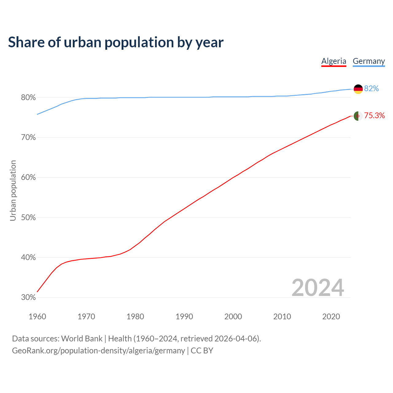 From 2004 to 2024, the share of urban population changed from 62.9% to 75.3% in Algeria and from 80.2% to 82% in Germany.