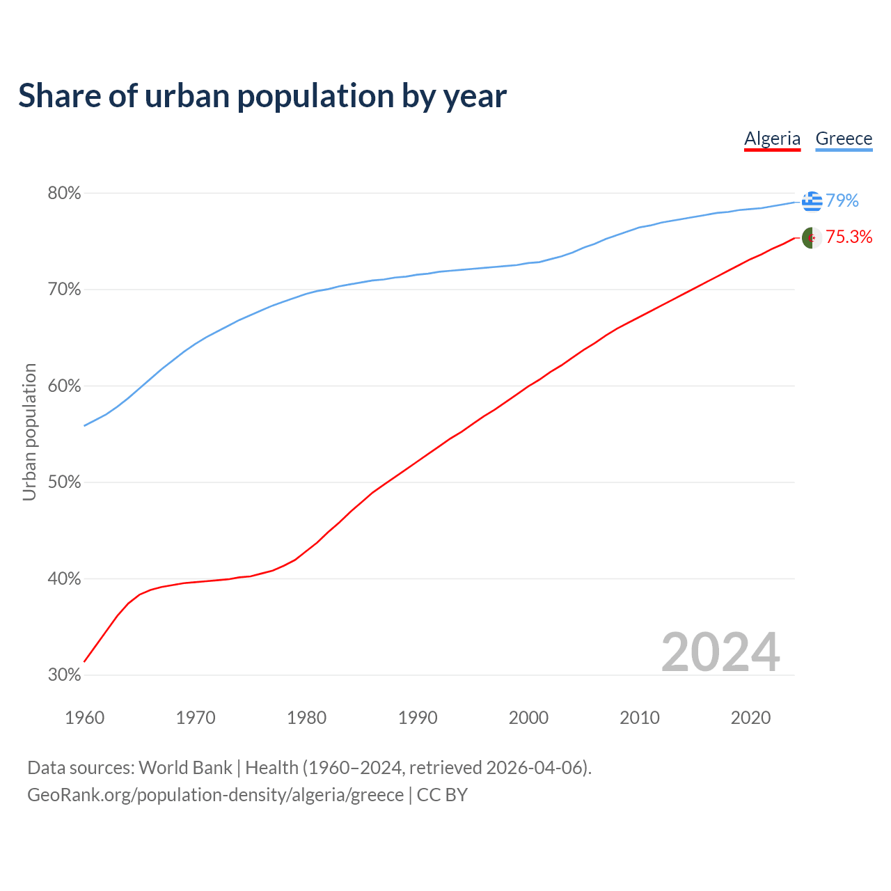 From 2004 to 2024, the share of urban population changed from 62.9% to 75.3% in Algeria and from 73.8% to 79% in Greece.