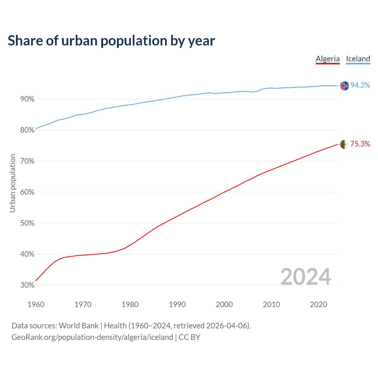From 2004 to 2024, the share of urban population changed from 62.9% to 75.3% in Algeria and from 92.4% to 94.2% in Iceland.