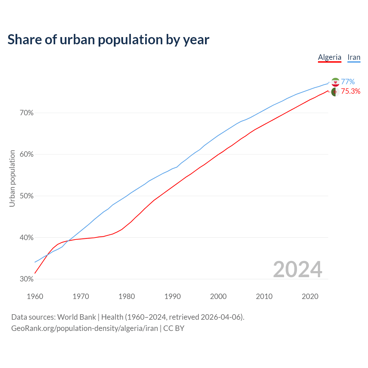 From 2004 to 2024, the share of urban population changed from 62.9% to 75.3% in Algeria and from 67.3% to 77% in Iran.