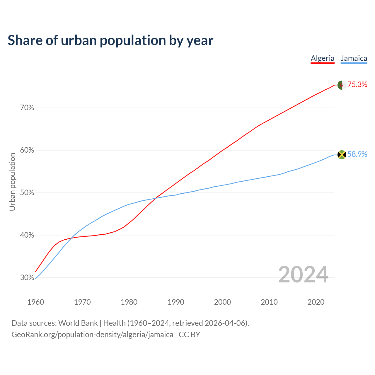 From 2004 to 2024, the share of urban population changed from 62.9% to 75.3% in Algeria and from 52.6% to 58.9% in Jamaica.
