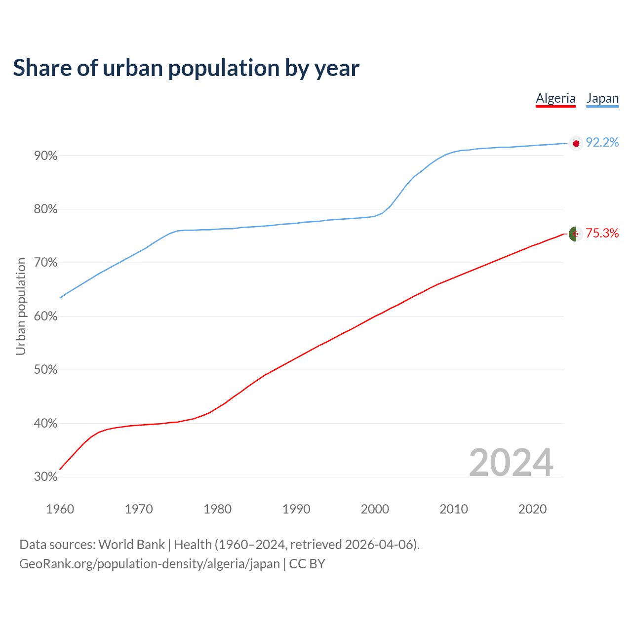 From 2004 to 2024, the share of urban population changed from 62.9% to 75.3% in Algeria and from 84.4% to 92.2% in Japan.