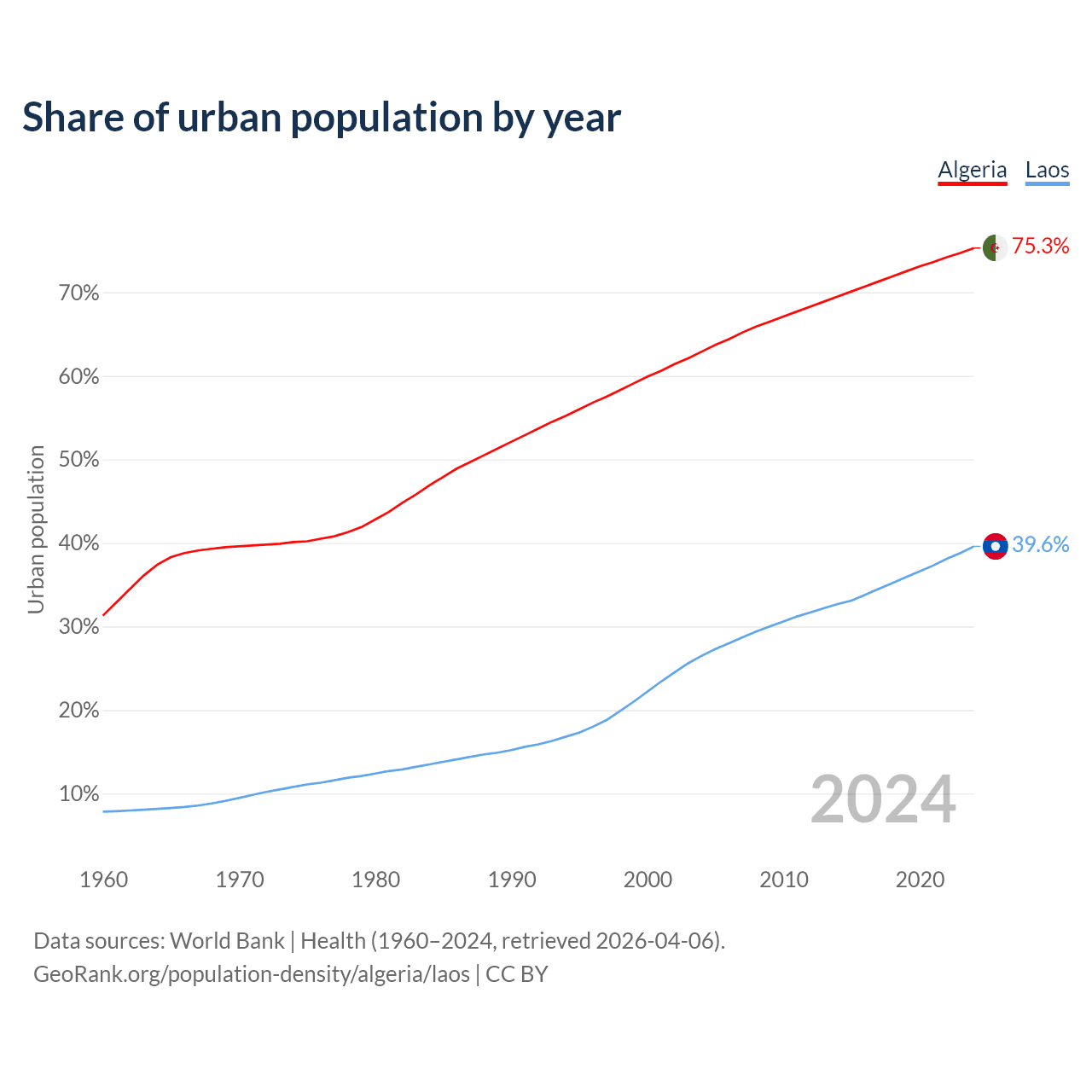 From 2004 to 2024, the share of urban population changed from 62.9% to 75.3% in Algeria and from 26.5% to 39.6% in Laos.