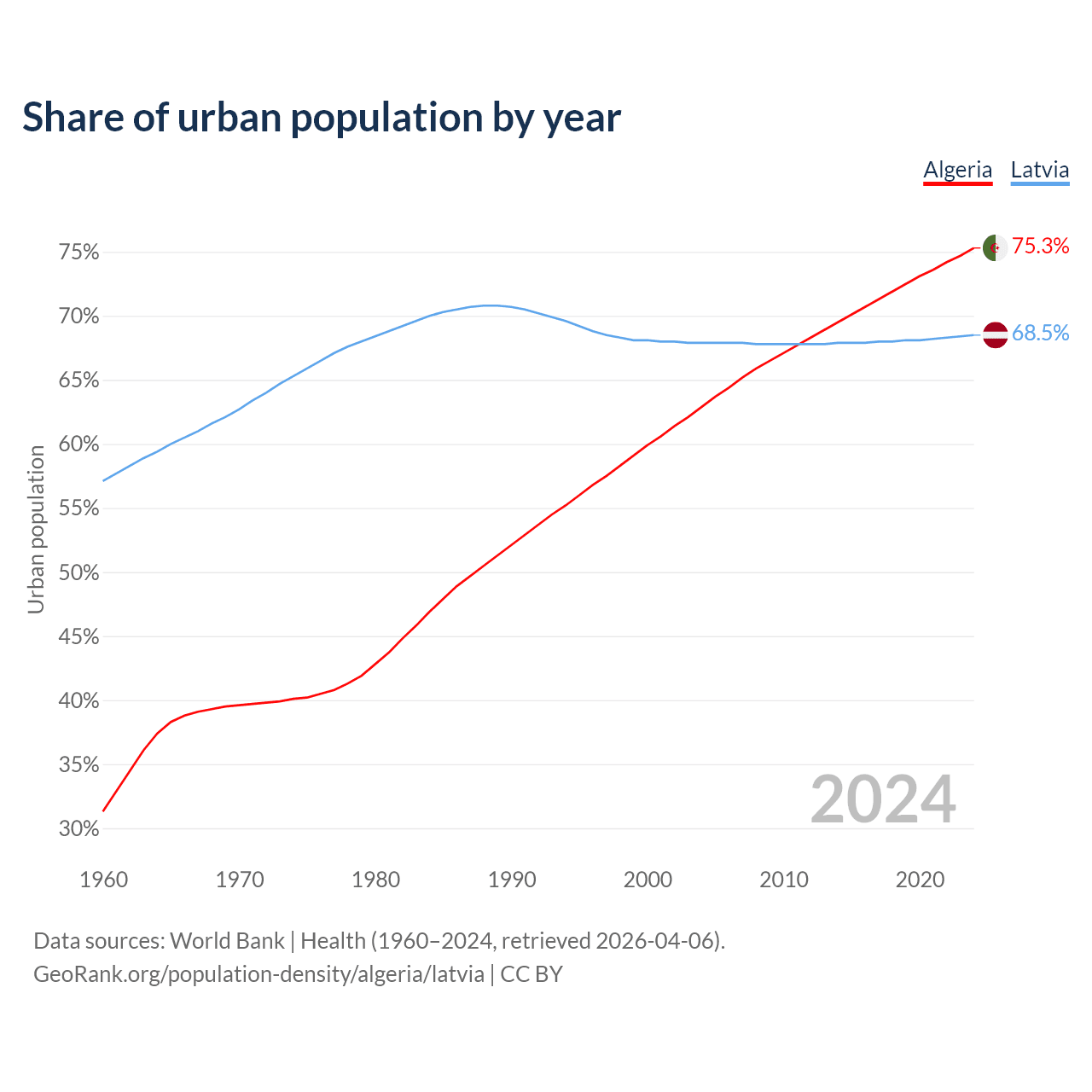 From 2004 to 2024, the share of urban population changed from 62.9% to 75.3% in Algeria and from 67.9% to 68.5% in Latvia.