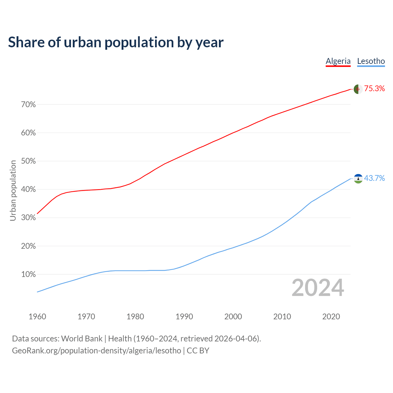From 2004 to 2024, the share of urban population changed from 62.9% to 75.3% in Algeria and from 21.8% to 43.7% in Lesotho.