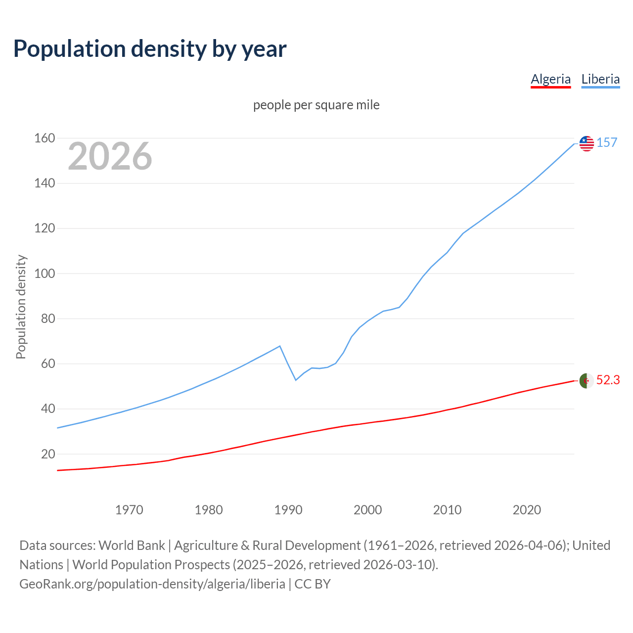 From 2006 to 2026, population density in Algeria increased by 42.9%, compared to a 67.6% growth in Liberia.