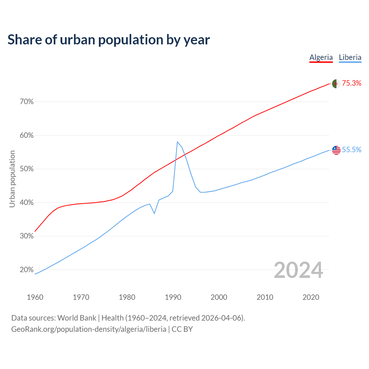 From 2004 to 2024, the share of urban population changed from 62.9% to 75.3% in Algeria and from 45.4% to 55.5% in Liberia.