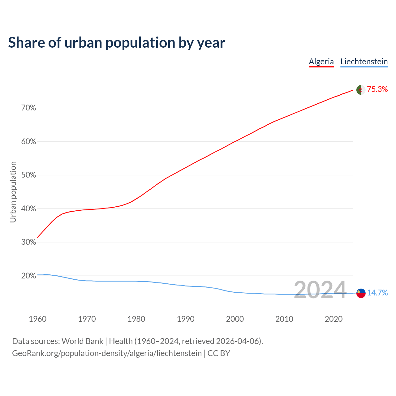 From 2004 to 2024, the share of urban population changed from 62.9% to 75.3% in Algeria and from 14.7% to 14.7% in Liechtenstein.