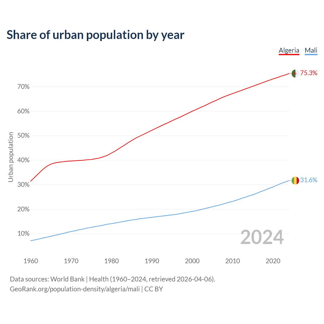From 2004 to 2024, the share of urban population changed from 62.9% to 75.3% in Algeria and from 20.5% to 31.6% in Mali.