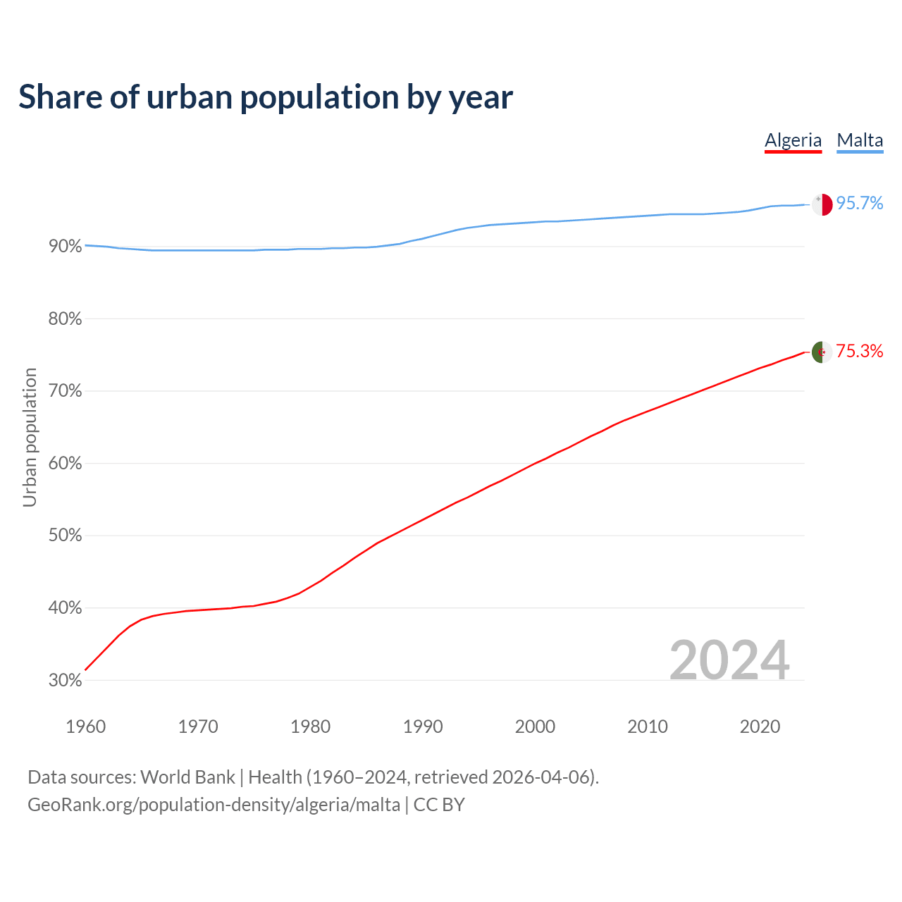 From 2004 to 2024, the share of urban population changed from 62.9% to 75.3% in Algeria and from 93.6% to 95.7% in Malta.