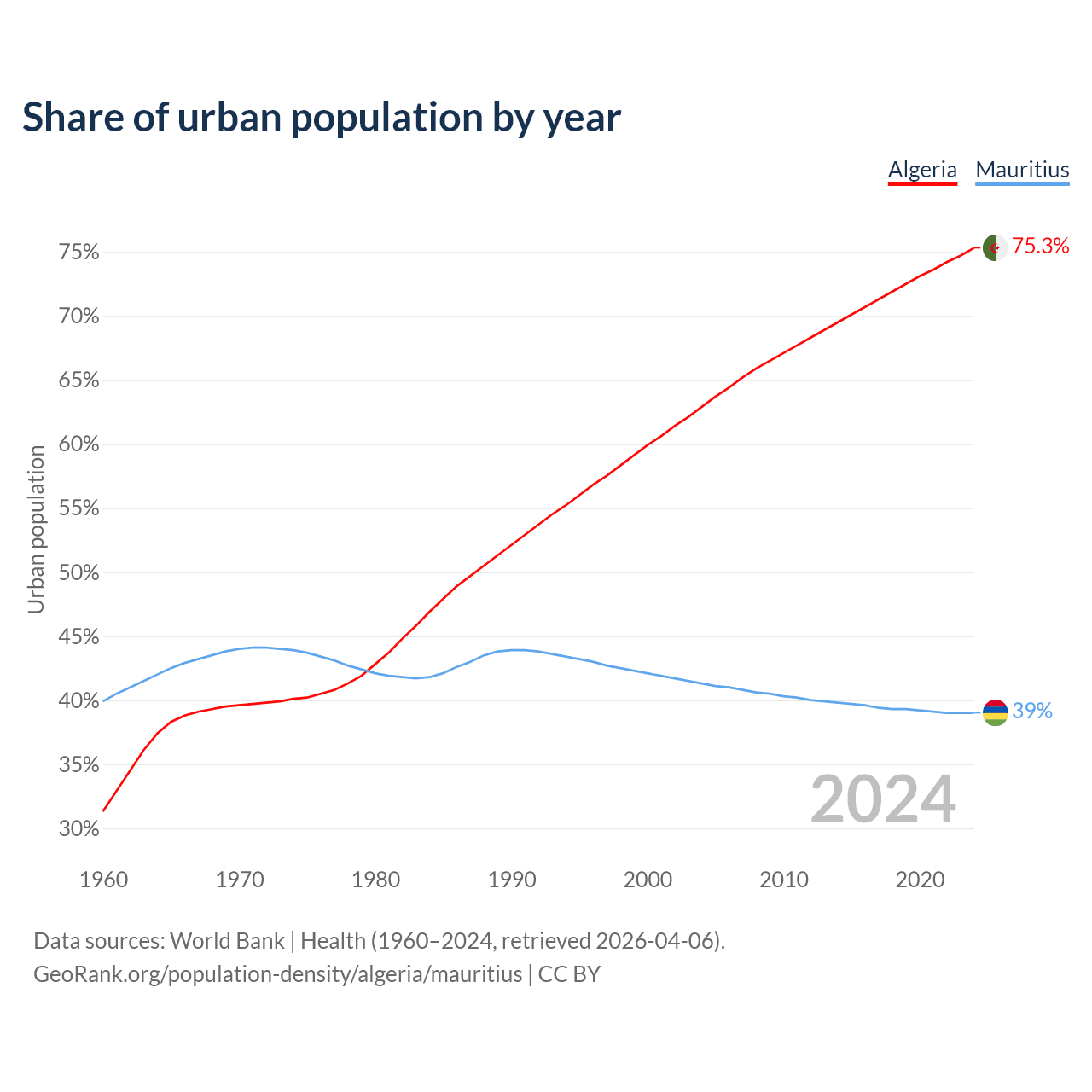 From 2004 to 2024, the share of urban population changed from 62.9% to 75.3% in Algeria and from 41.3% to 39% in Mauritius.