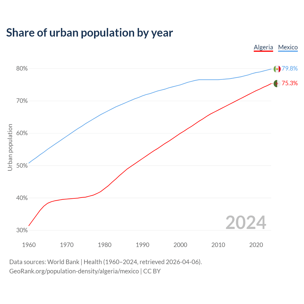 From 2004 to 2024, the share of urban population changed from 62.9% to 75.3% in Algeria and from 76.3% to 79.8% in Mexico.