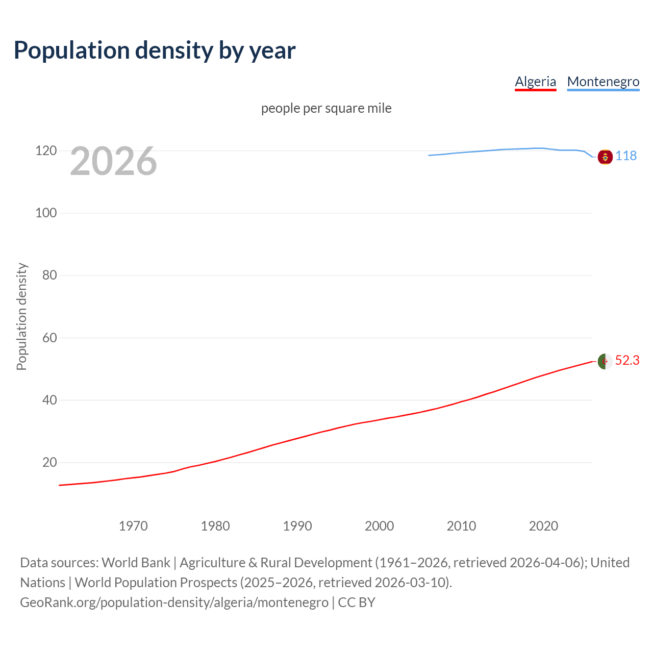 From 2006 to 2026, population density in Algeria increased by 42.9%, compared to a 0.44% decline in Montenegro.