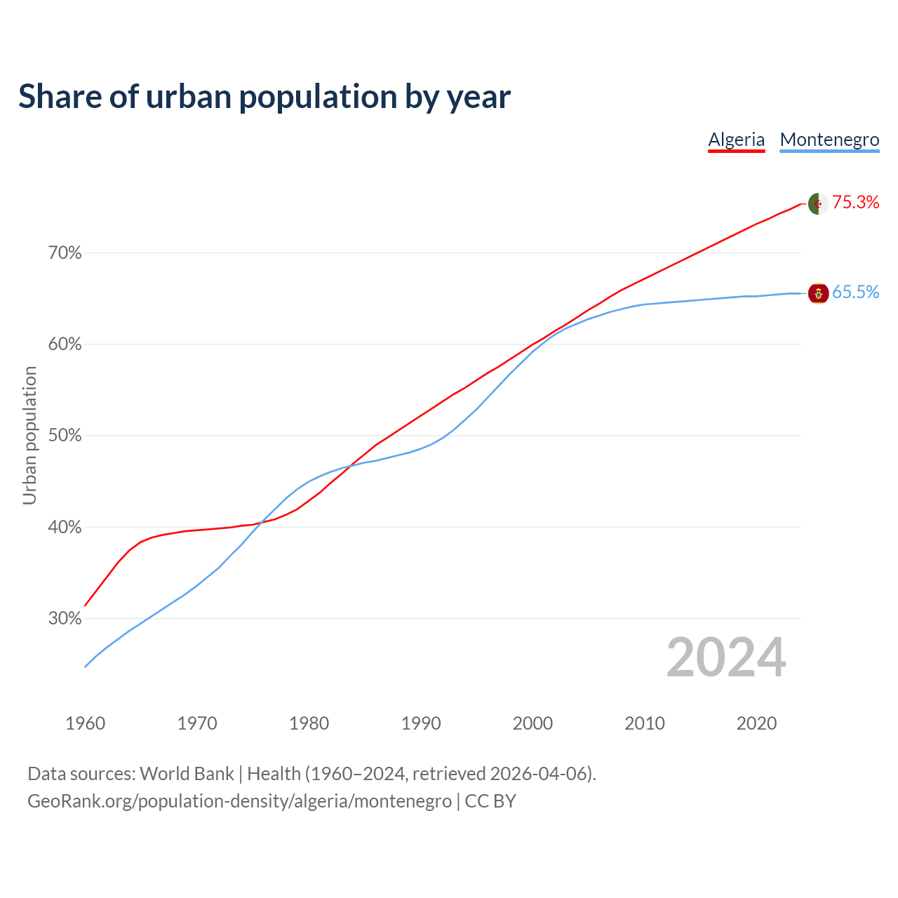 From 2004 to 2024, the share of urban population changed from 62.9% to 75.3% in Algeria and from 62.2% to 65.5% in Montenegro.