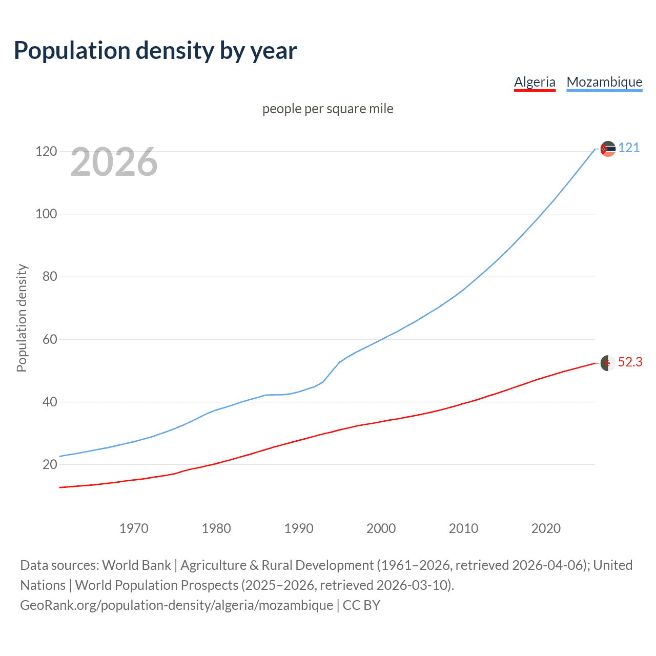 From 2006 to 2026, population density in Algeria increased by 42.9%, compared to a 76.4% growth in Mozambique.