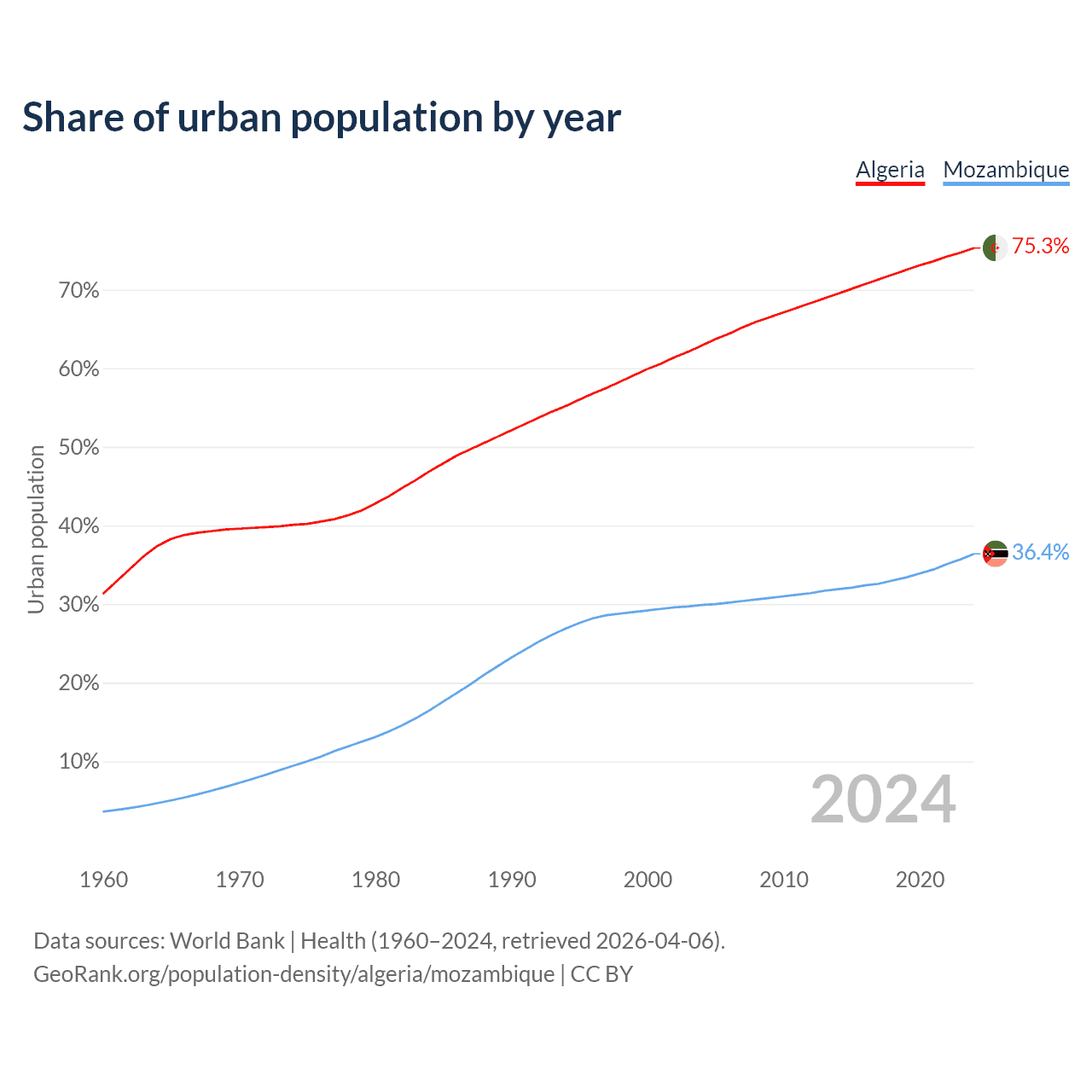 From 2004 to 2024, the share of urban population changed from 62.9% to 75.3% in Algeria and from 29.9% to 36.4% in Mozambique.