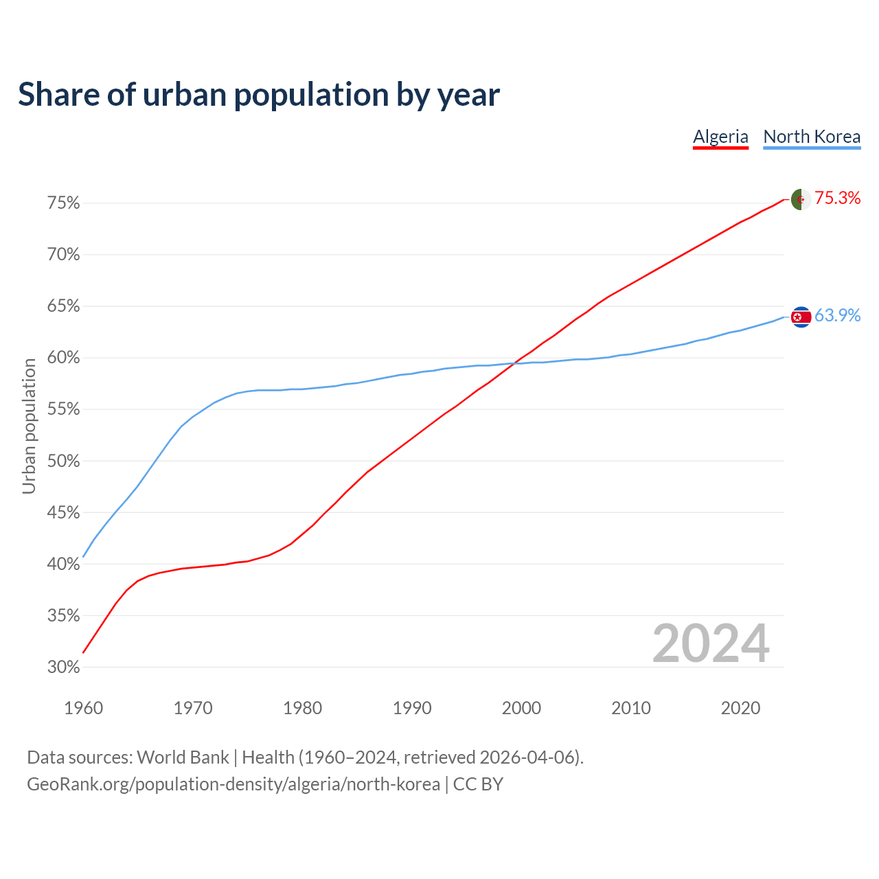 From 2004 to 2024, the share of urban population changed from 62.9% to 75.3% in Algeria and from 59.7% to 63.9% in North Korea.