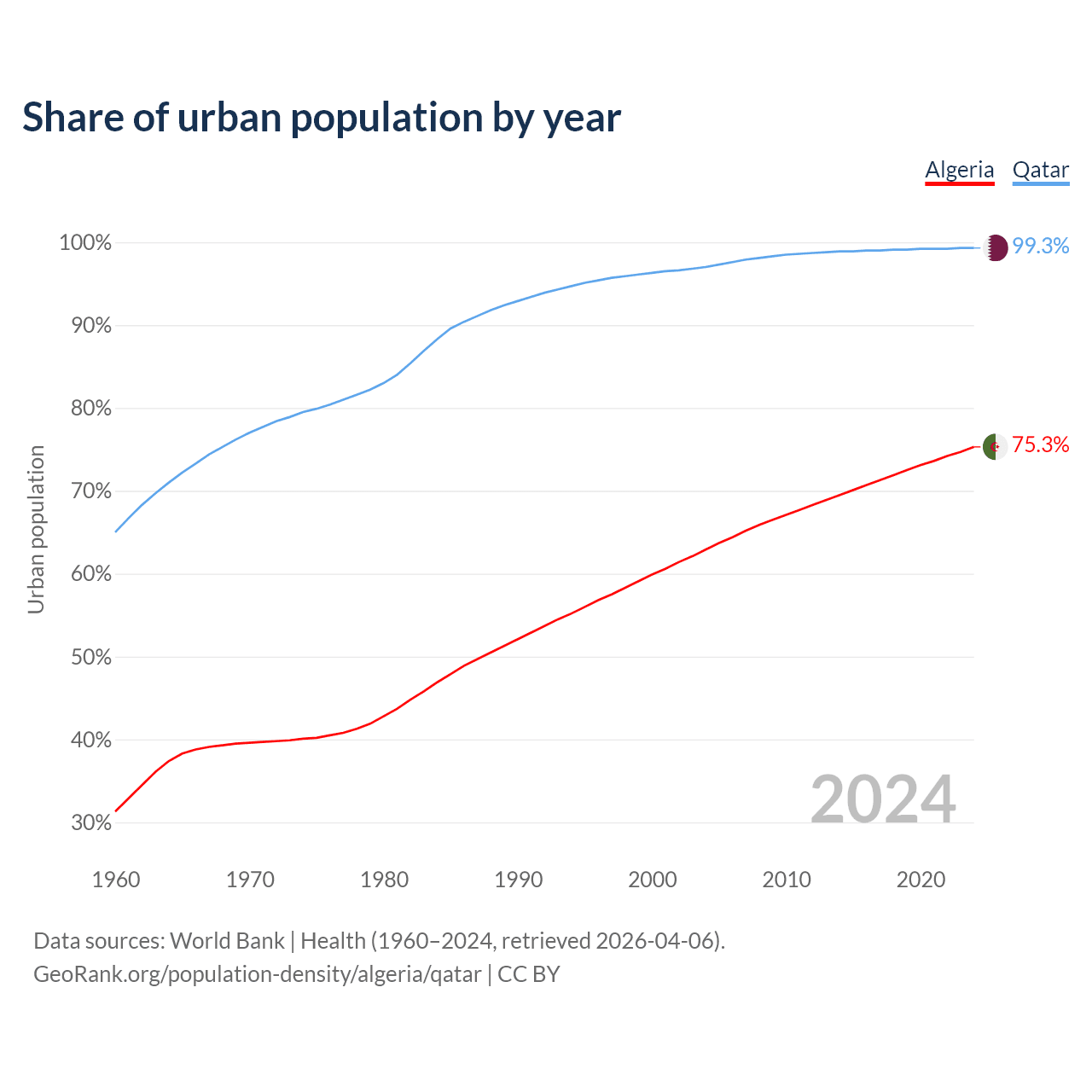 From 2004 to 2024, the share of urban population changed from 62.9% to 75.3% in Algeria and from 97% to 99.3% in Qatar.