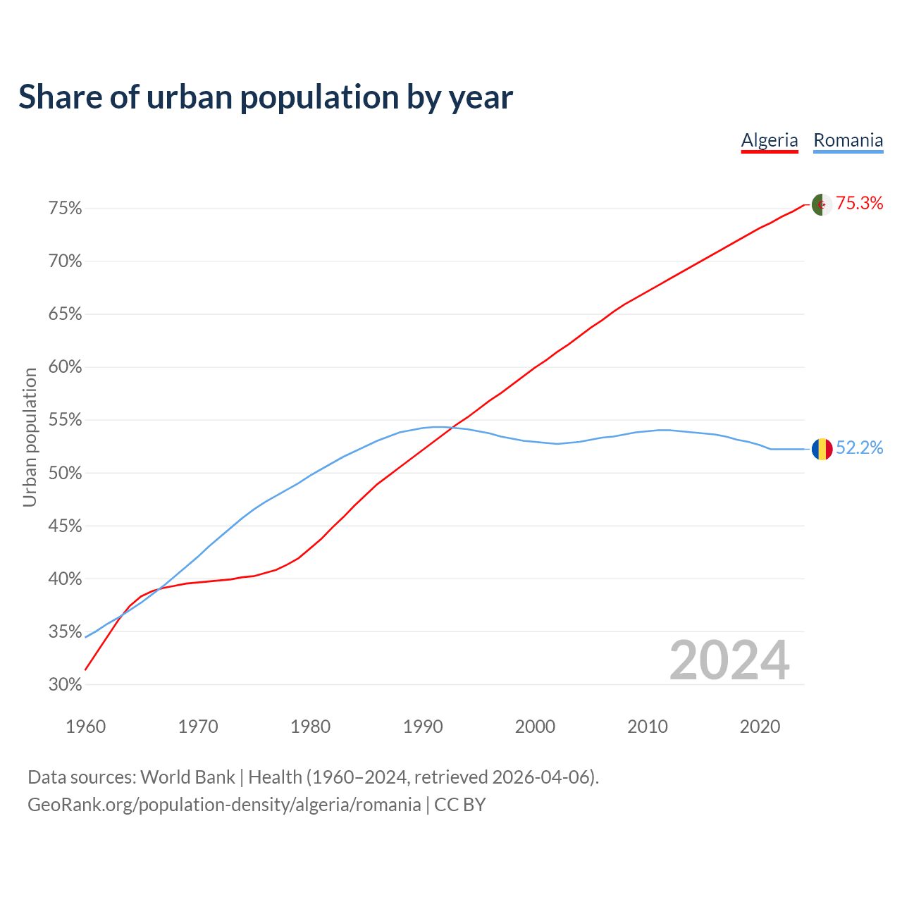 From 2004 to 2024, the share of urban population changed from 62.9% to 75.3% in Algeria and from 52.9% to 52.2% in Romania.