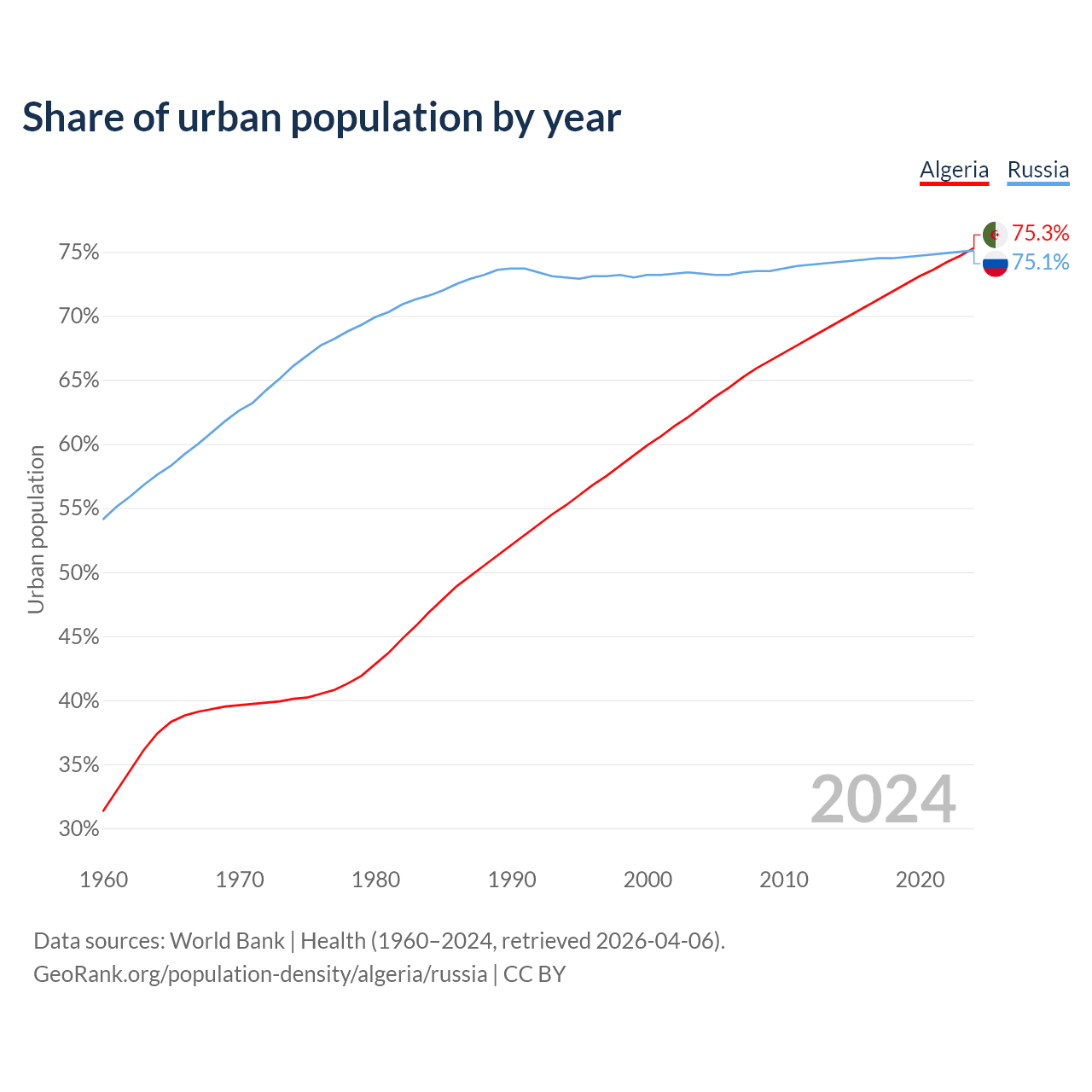 From 2004 to 2024, the share of urban population changed from 62.9% to 75.3% in Algeria and from 73.3% to 75.1% in Russia.