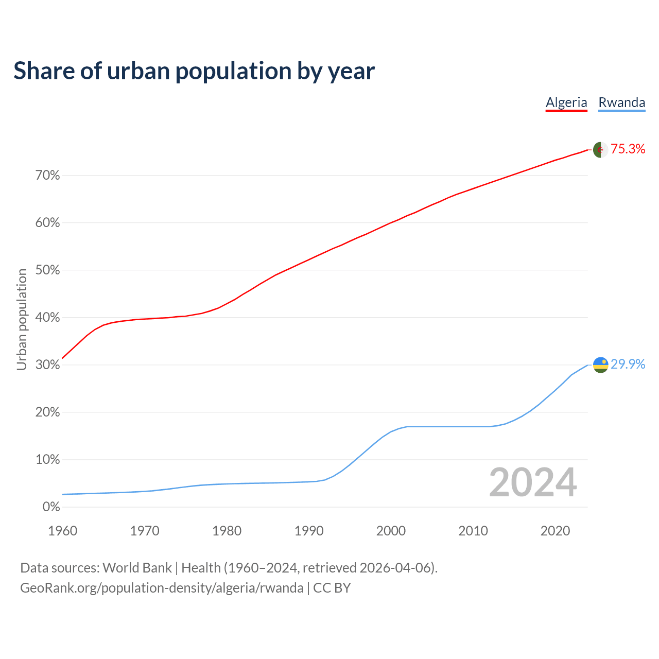 From 2006 to 2026, population density in Algeria increased by 42.9%, compared to a 60.1% growth in Rwanda.