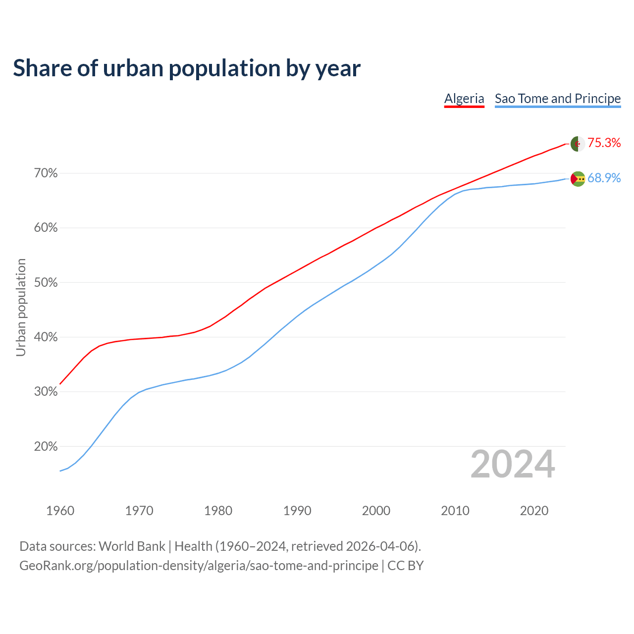 From 2004 to 2024, the share of urban population changed from 62.9% to 75.3% in Algeria and from 57.9% to 68.9% in Sao Tome and Principe.