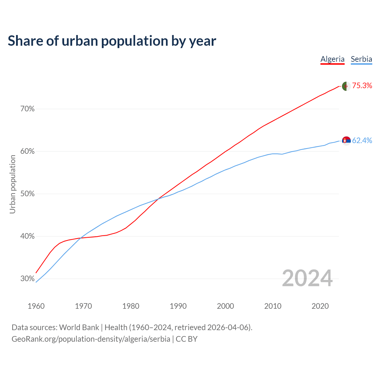 From 2004 to 2024, the share of urban population changed from 62.9% to 75.3% in Algeria and from 57.3% to 62.4% in Serbia.