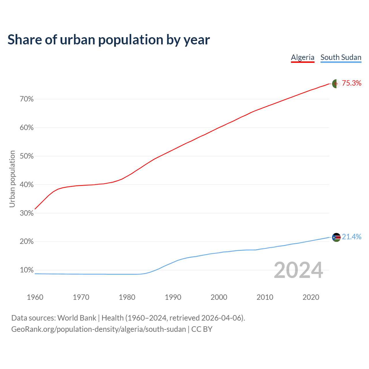 From 2004 to 2024, the share of urban population changed from 62.9% to 75.3% in Algeria and from 16.8% to 21.4% in South Sudan.