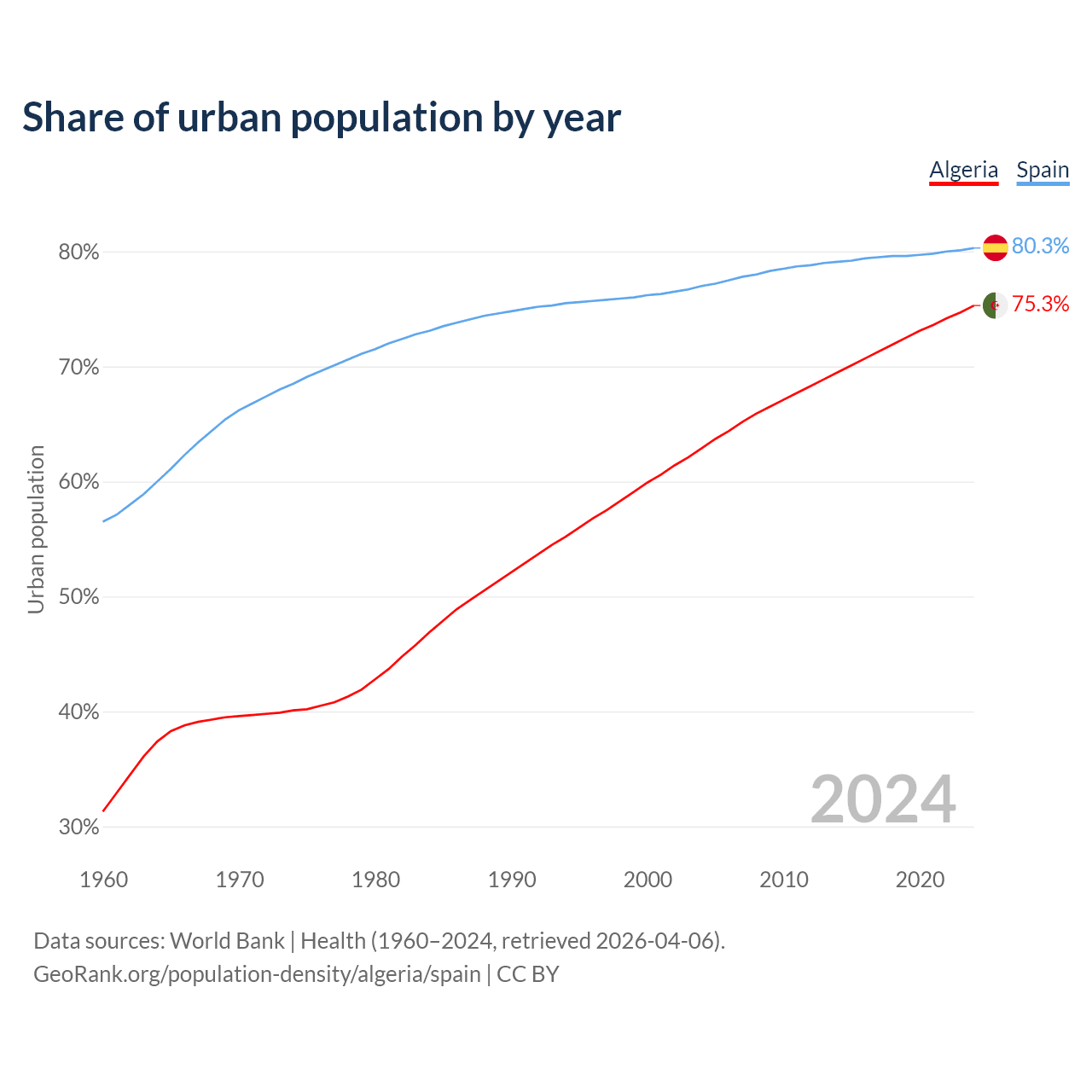 From 2004 to 2024, the share of urban population changed from 62.9% to 75.3% in Algeria and from 77% to 80.3% in Spain.