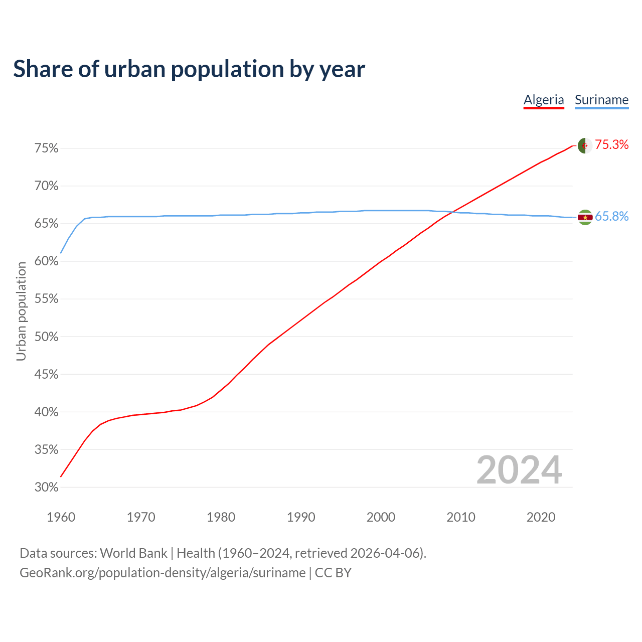 From 2004 to 2024, the share of urban population changed from 62.9% to 75.3% in Algeria and from 66.7% to 65.8% in Suriname.