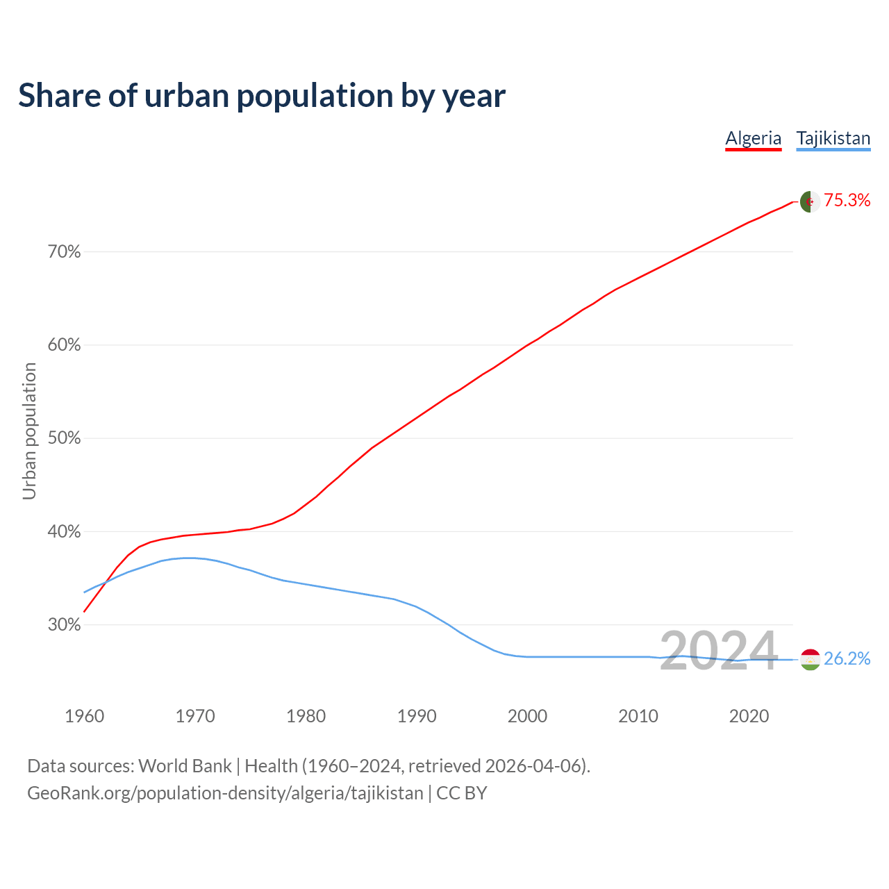 From 2004 to 2024, the share of urban population changed from 62.9% to 75.3% in Algeria and from 26.5% to 26.2% in Tajikistan.