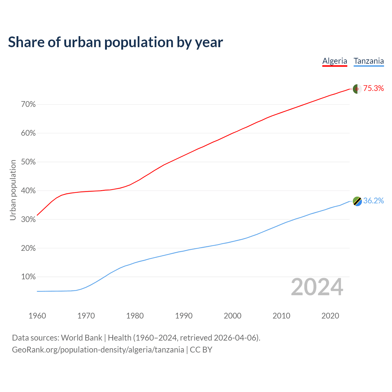 From 2004 to 2024, the share of urban population changed from 62.9% to 75.3% in Algeria and from 24.1% to 36.2% in Tanzania.