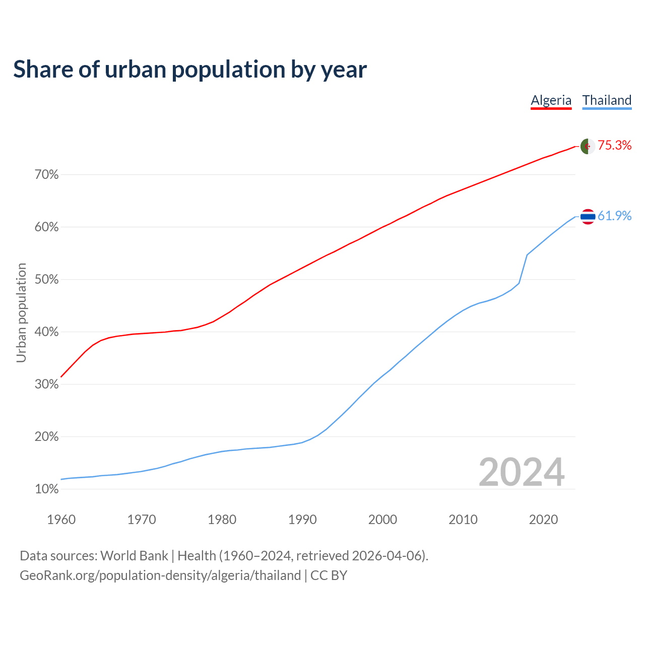 From 2004 to 2024, the share of urban population changed from 62.9% to 75.3% in Algeria and from 36.8% to 61.9% in Thailand.