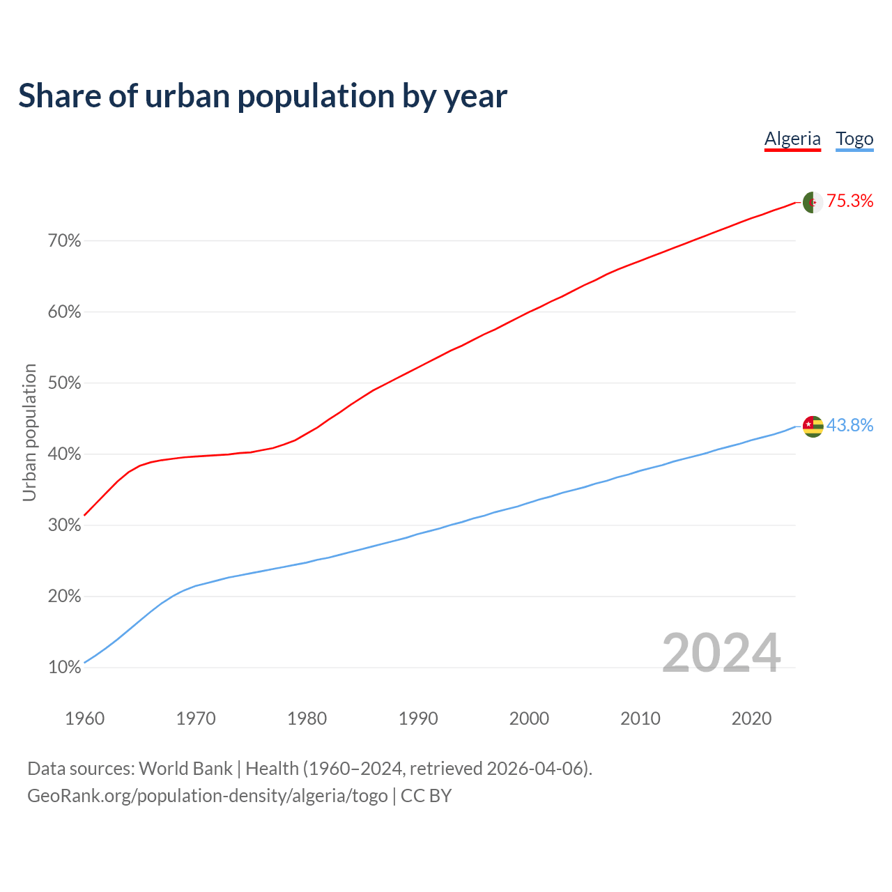 From 2004 to 2024, the share of urban population changed from 62.9% to 75.3% in Algeria and from 34.9% to 43.8% in Togo.