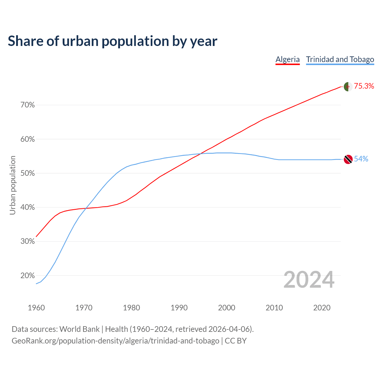 From 2004 to 2024, the share of urban population changed from 62.9% to 75.3% in Algeria and from 55.6% to 54% in Trinidad and Tobago.